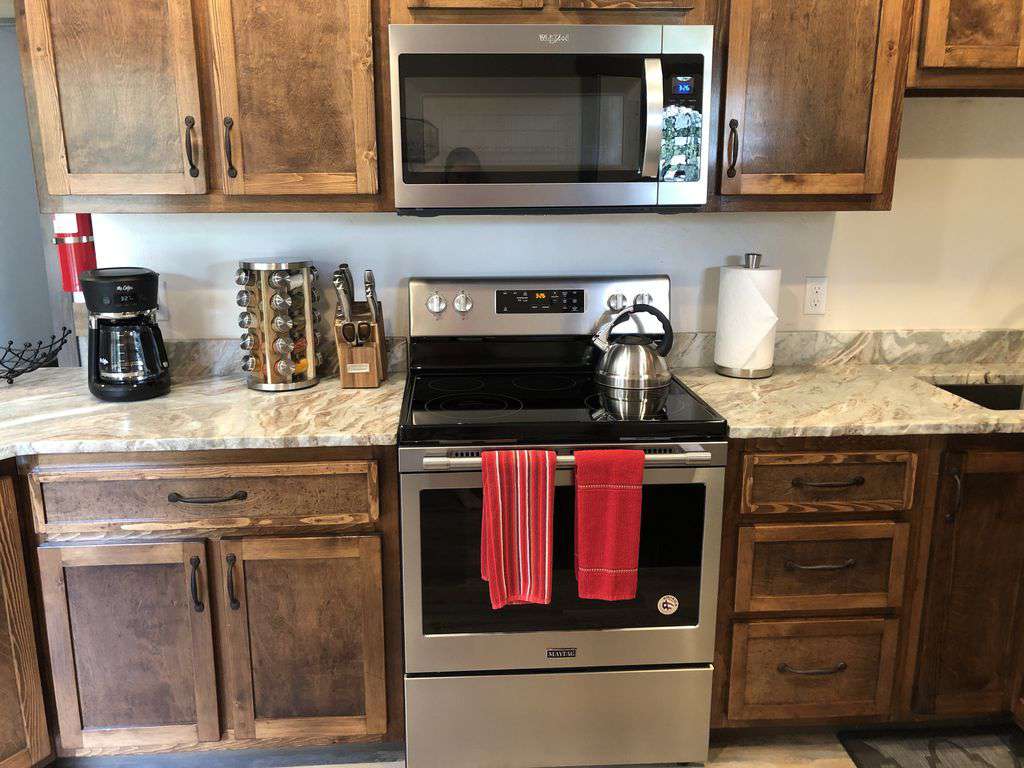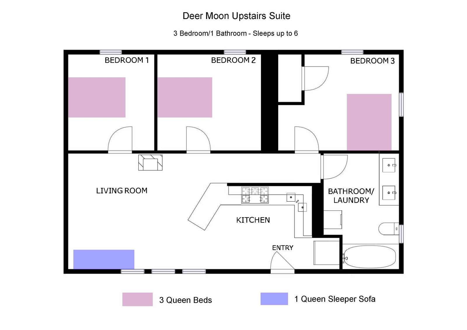 Our Deer Moon is an upstairs 3 bedroom 1 bathroom unit equipped with brand new washer/dryer and appliances. This unit has been completely remodeled, so everything is brand new! Exquisitely designed, the villa has 3 bedrooms, each with a queen sized bed, and a queen sized sleeper sofa in the living room, making it able to accommodate up to 6 people. With full kitchen, full sized refrigerator, oven/stove, dishwasher, and microwave, you are able to easily cook meals if you would rather not go out. The unit overlooks a large pond and pasture area and has a deck if you would like to sit outside and enjoy the atmosphere. The property itself is 15 acres with 2 ponds, lots of lawn space, trees, and pasture. There are multiple housing options on the property ranging from 5 bedroom cabins to a 1 bedroom handicap accessible apartment if you would like to rent several units together. Please don't hesitate to reach out with questions!