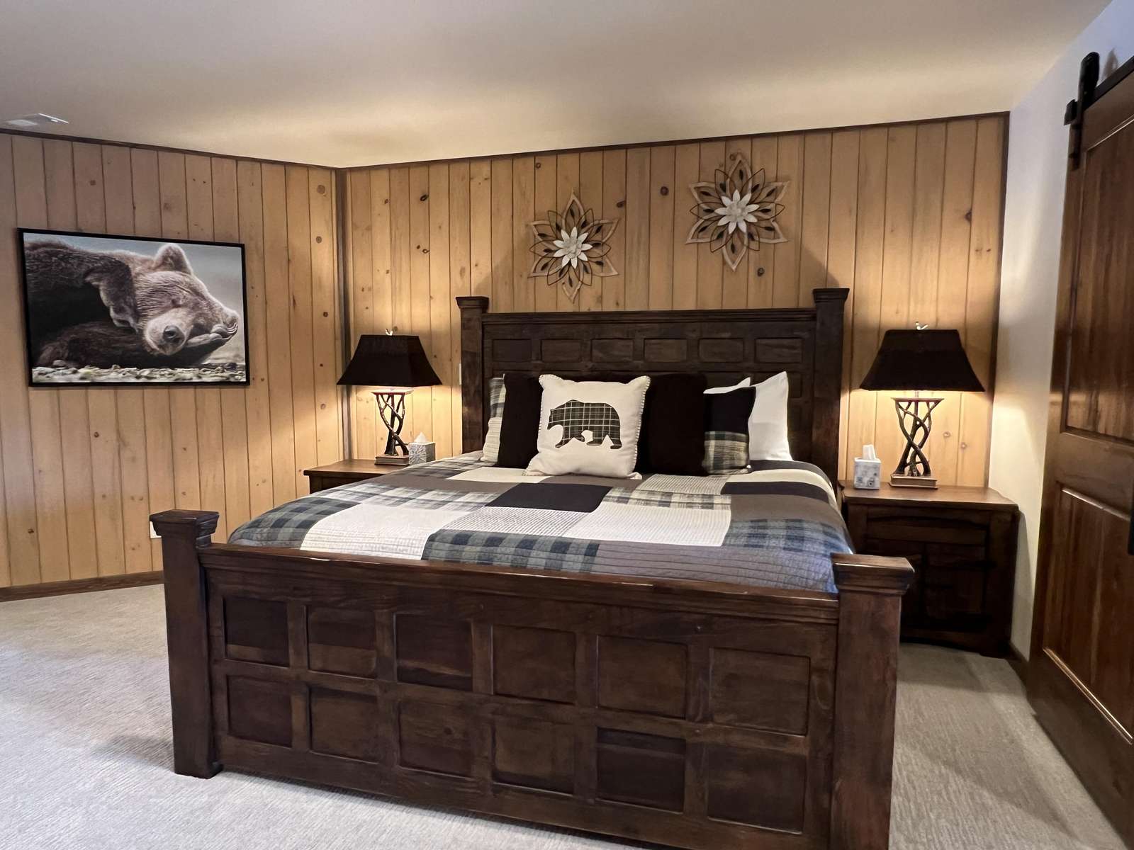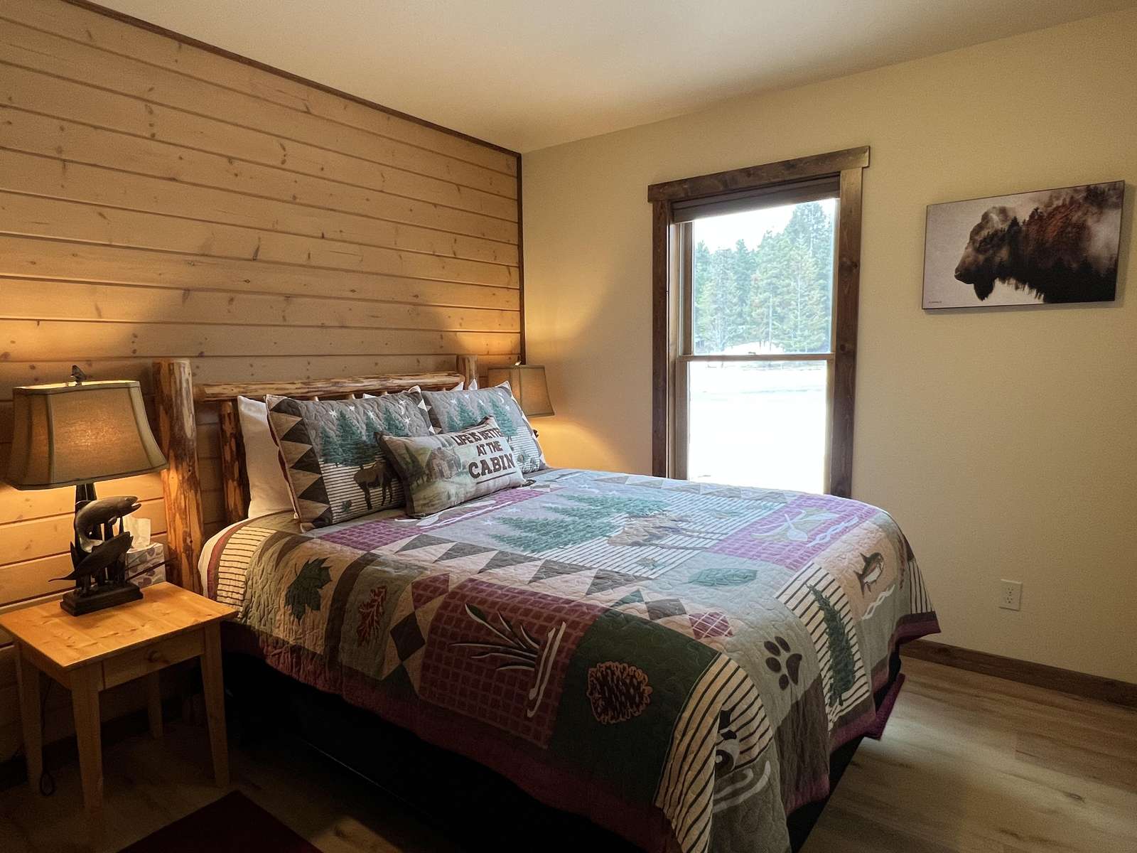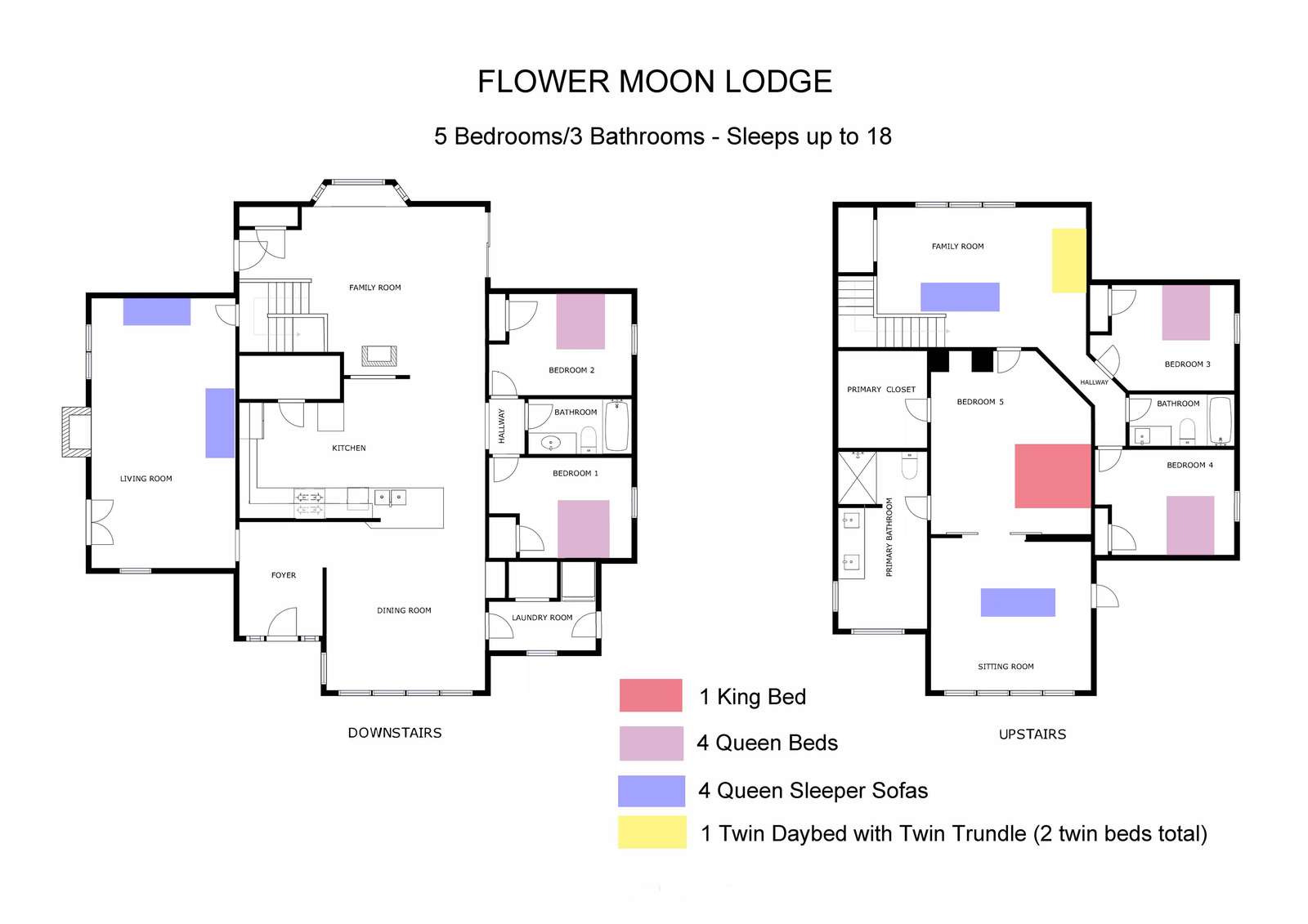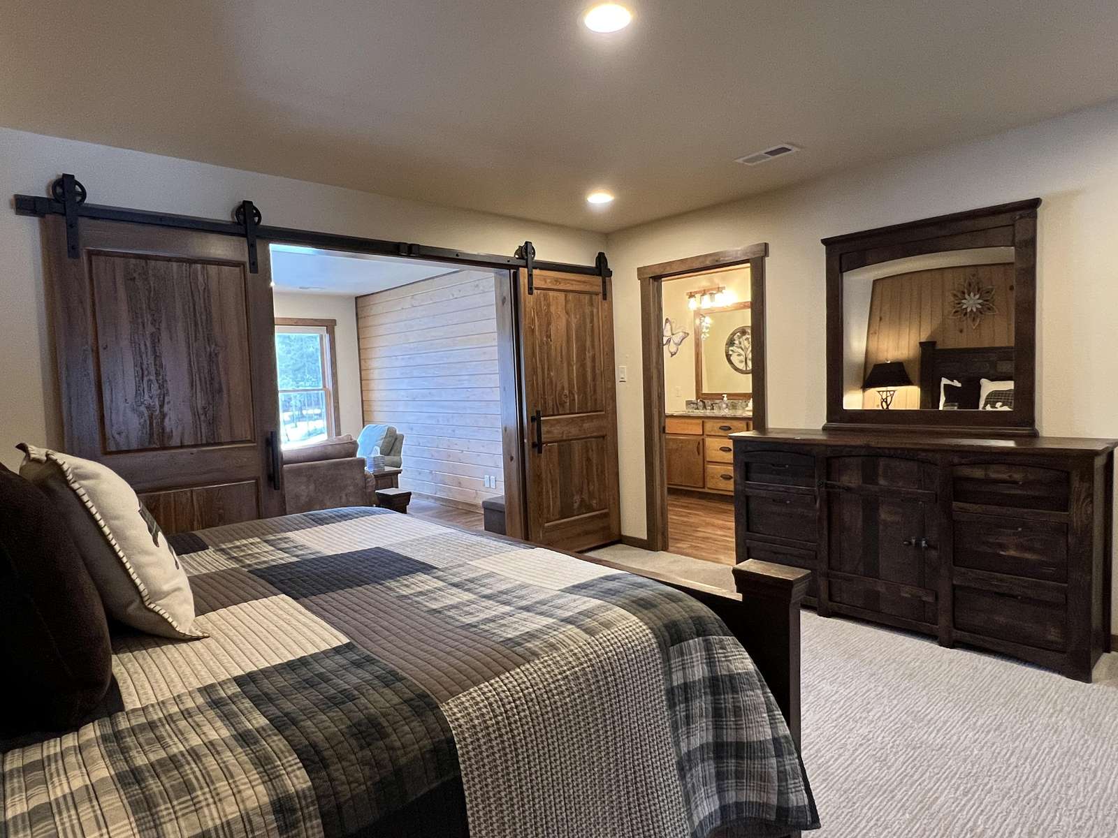 Our Flowermoon Lodge is a 5 bedroom, 3 bathroom house, equipped with brand new washer/dryer and appliances. This unit has been completely remodeled, so everything is brand new! Exquisitely designed, the house has 4 bedrooms with queen sized beds, and a master suite with a king sized bed. There are also 4 queen sized sleeper sofas and a day bed throughout the house allowing it to accommodate up to 18 people. With a huge kitchen, full sized refrigerator, oven/stove, dishwasher, and microwave, you are able to cook full meals if you would rather not go out. The unit overlooks a large pond and pasture area and has a large deck that wraps around half the house if you would like to sit outside and enjoy the atmosphere. The deck is also great for BBQing. The property itself is 15 acres with 2 ponds, lots of lawn space, trees, wooded areas, and pasture. There are multiple housing options on the property ranging from 5 bedroom cabins to a 1 bedroom handicap accessible apartment if you would like to rent several units together. Please don't hesitate to reach out with questions!
