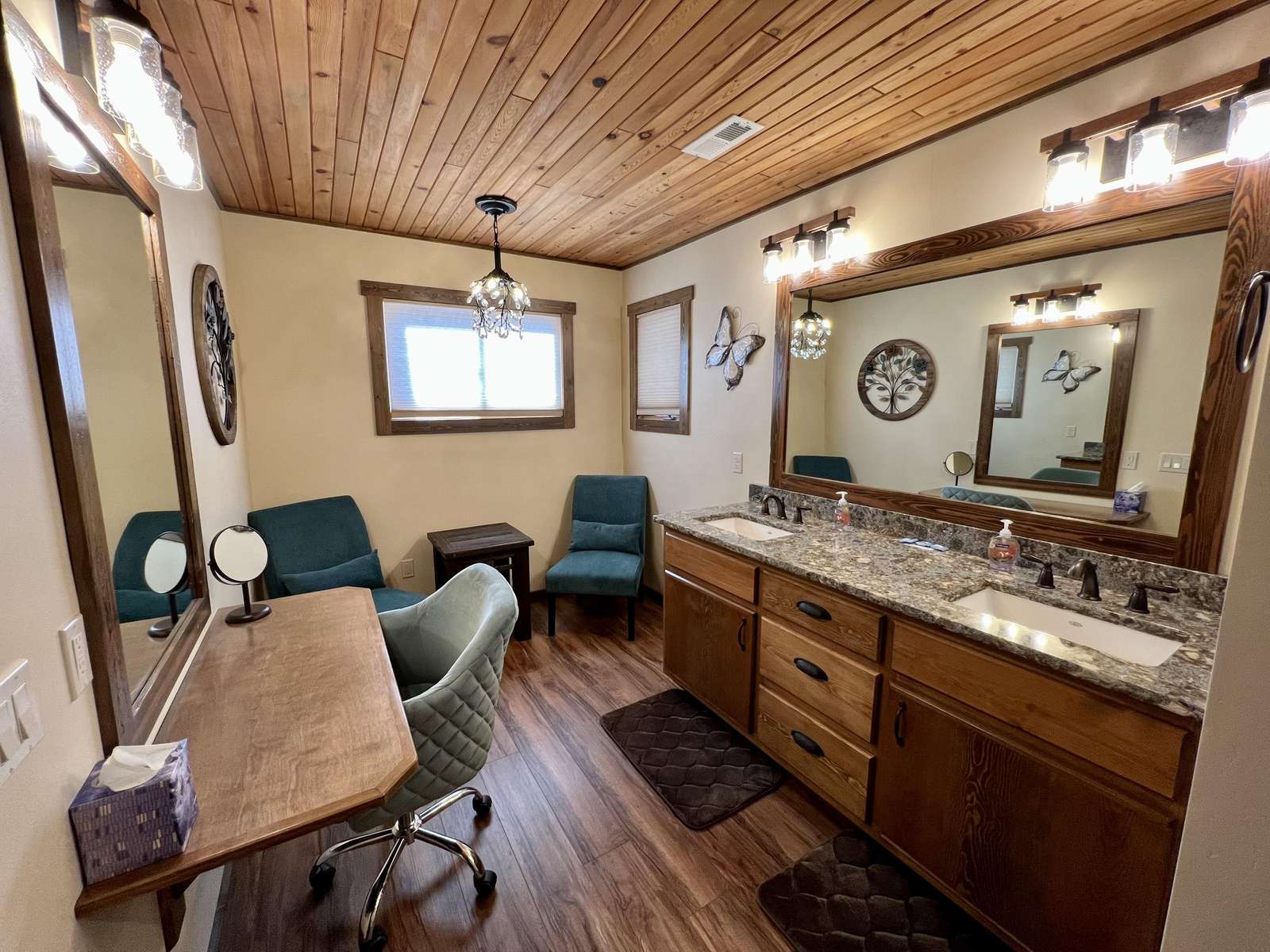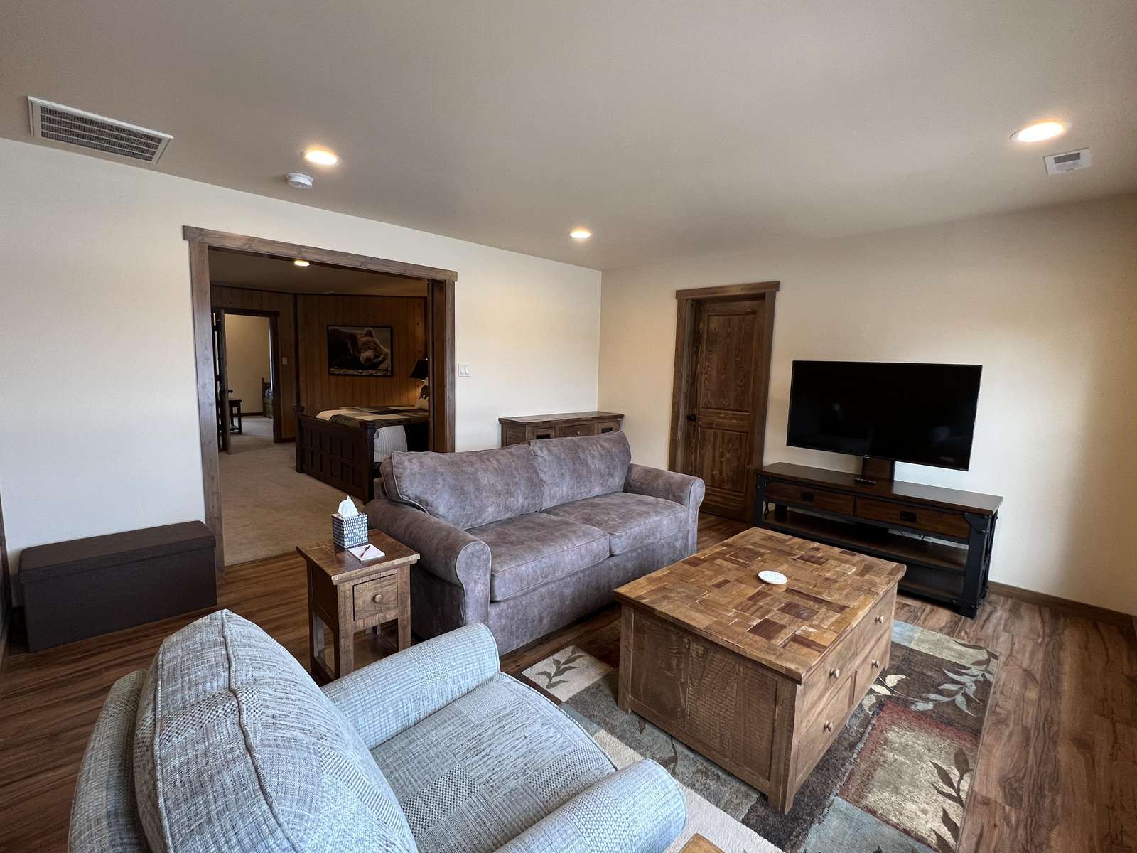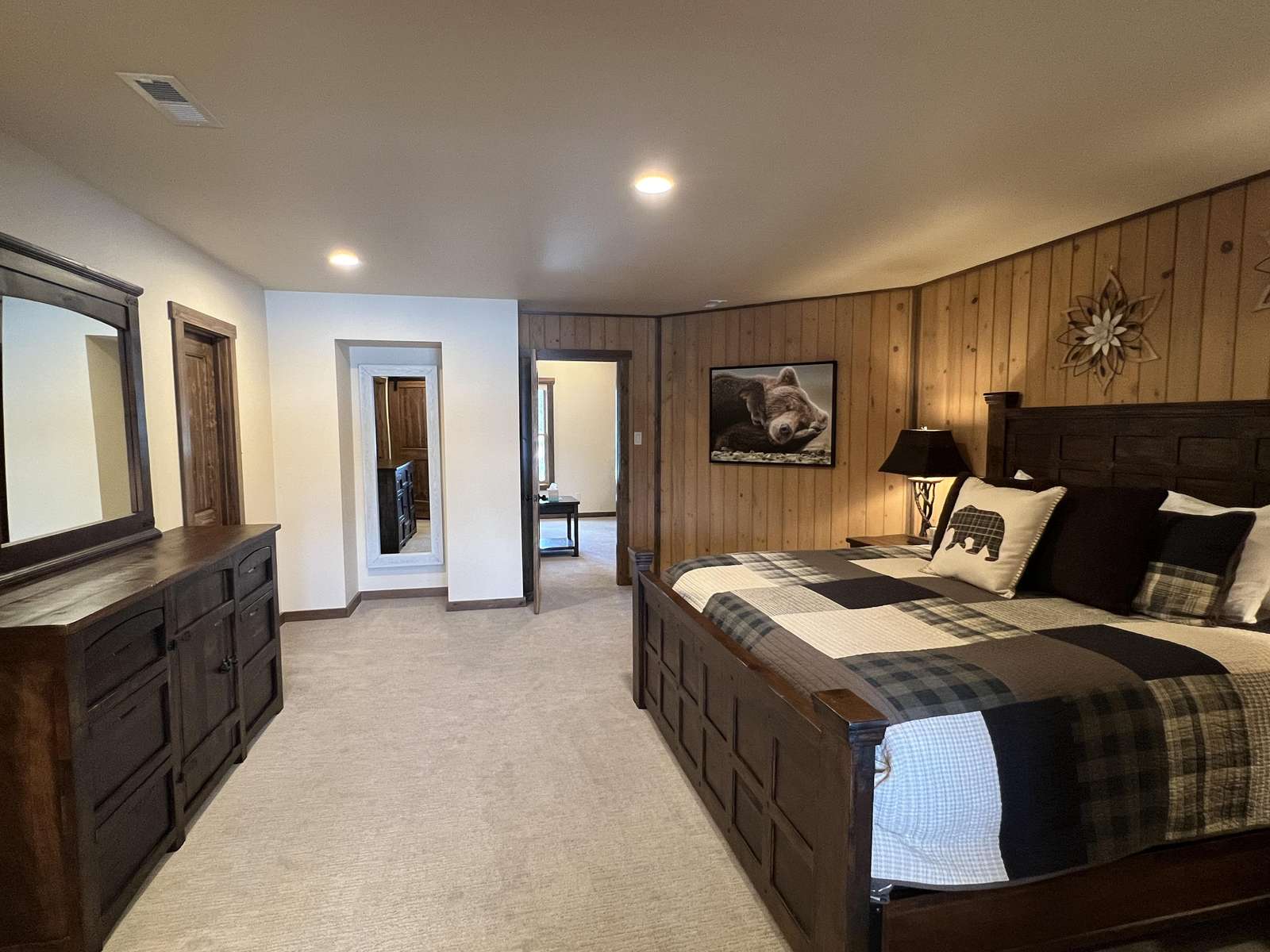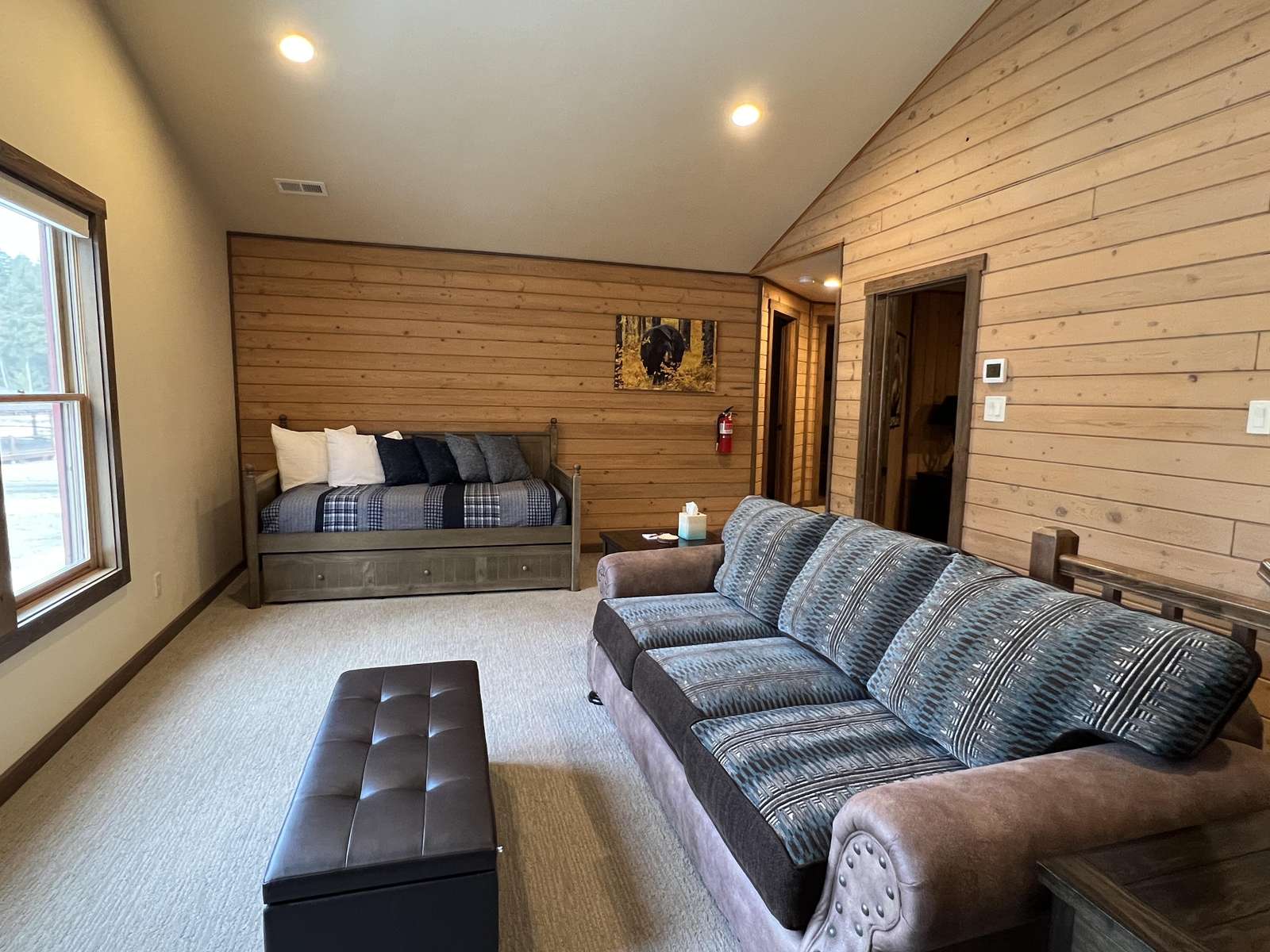 Our Flowermoon Lodge is a 5 bedroom, 3 bathroom house, equipped with brand new washer/dryer and appliances. This unit has been completely remodeled, so everything is brand new! Exquisitely designed, the house has 4 bedrooms with queen sized beds, and a master suite with a king sized bed. There are also 4 queen sized sleeper sofas and a day bed throughout the house allowing it to accommodate up to 18 people. With a huge kitchen, full sized refrigerator, oven/stove, dishwasher, and microwave, you are able to cook full meals if you would rather not go out. The unit overlooks a large pond and pasture area and has a large deck that wraps around half the house if you would like to sit outside and enjoy the atmosphere. The deck is also great for BBQing. The property itself is 15 acres with 2 ponds, lots of lawn space, trees, wooded areas, and pasture. There are multiple housing options on the property ranging from 5 bedroom cabins to a 1 bedroom handicap accessible apartment if you would like to rent several units together. Please don't hesitate to reach out with questions!